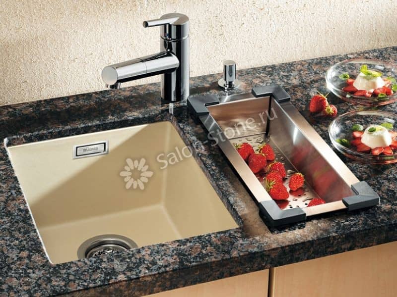 Каменные мойки обладают условной термостойкостью, поэтому если необходимо продлить срок их эксплуатации, не стоит ставить на них сковородки и кастрюли с горячей плиты. Также при очистке рабочей поверхности не использовать абразивные моющие средства, жесткие щетки и металлические скребки.